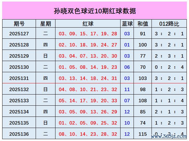上期归来:双色球第2025136期开出奖号:红球08、10、14、23、28、32;蓝球12,其中红球和值为115,012路比为0:2:4,奇偶比1:5,蓝球开出大偶数号码12。